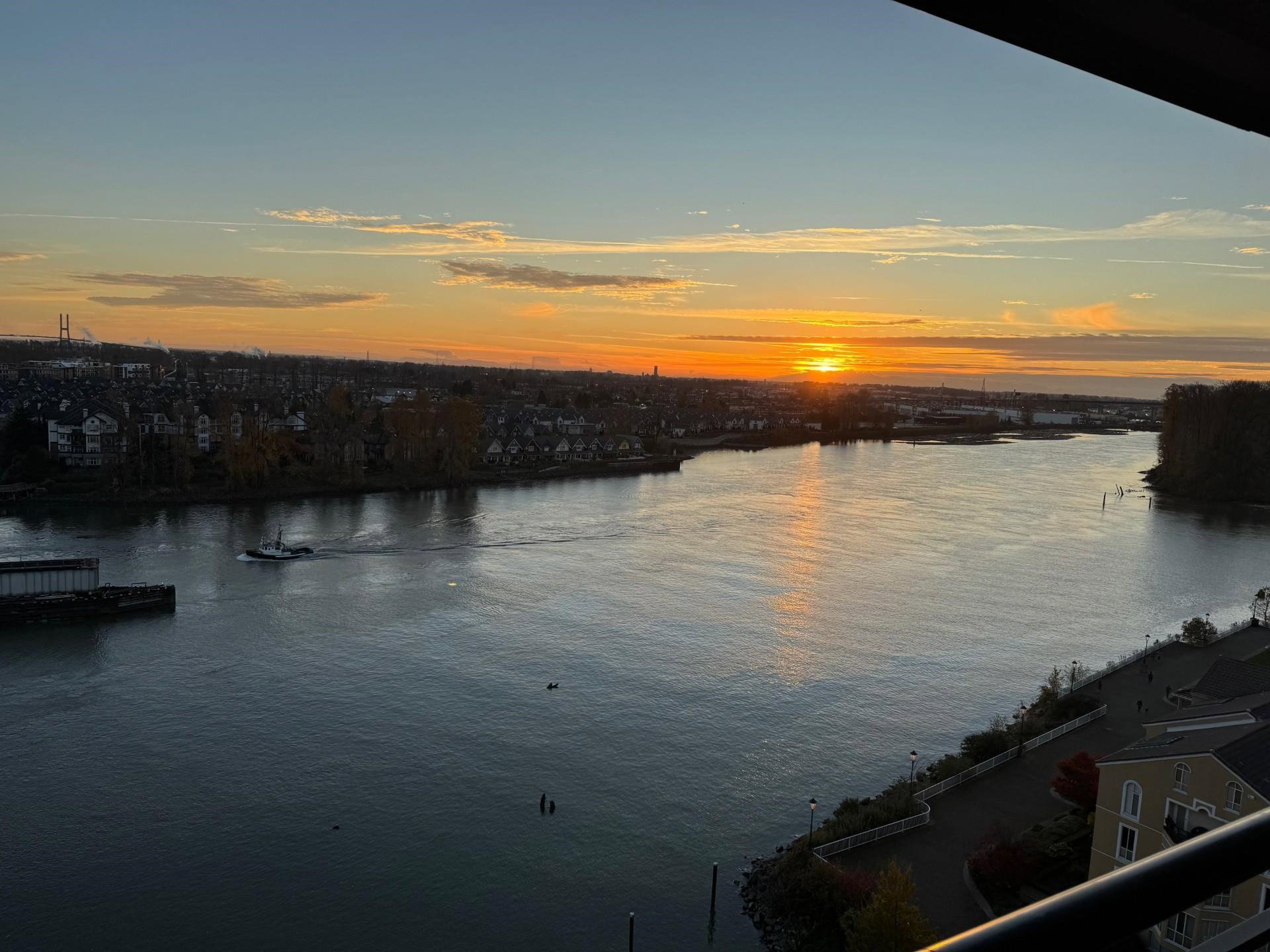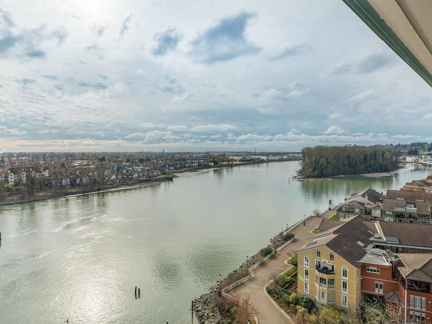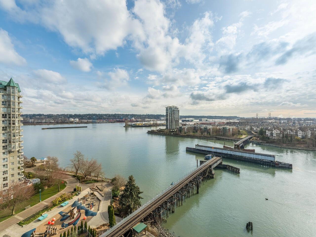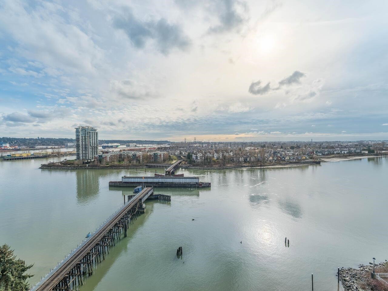PRIME WATERFRONT at New Westminter Quay! Enjoy UNOBSTRUCTED EXPANSIVE VIEWS of the lively FRASER RIVER from your arm chair! From sunrise to sunset, immerse in the dynamics of a working river in the privacy of your own home! Upgrades and features of this fabulous 1,524 sf, 2 bdrm + den, 2 bath, upper floor southeast corner unit include an open & inviting modern chef’s kitchen, Bosch appliances, barn door walk-in pantry, laminate flooring, gas fireplace, and 92 sf open BBQ balcony. Perfect layout for entertaining & family gatherings! Amenities included pool, hot tub, sauna, party room & exercise area. Steps to the river boardwalk, parks & walking distance to restaurants, shopping, services & skytrain. TWO PARKING STALLS, rentals & 2 pets OK.