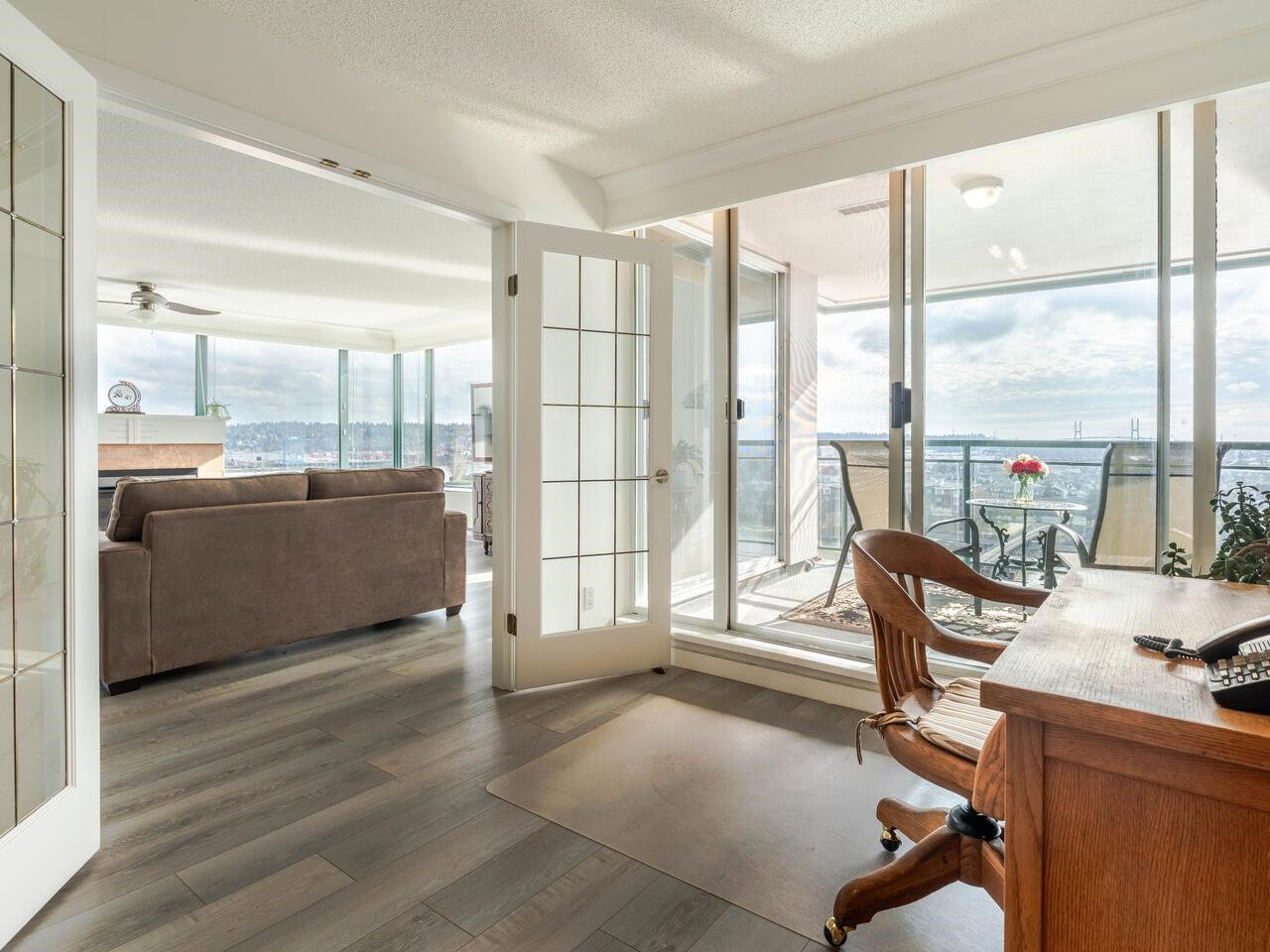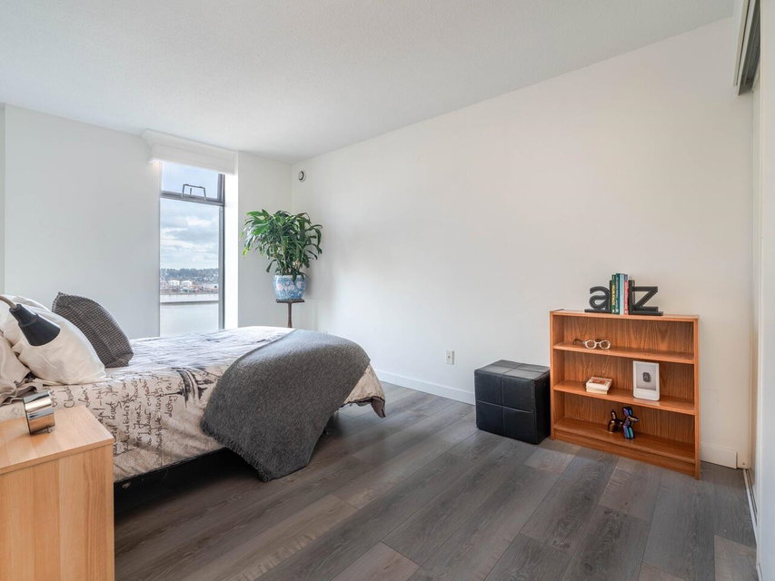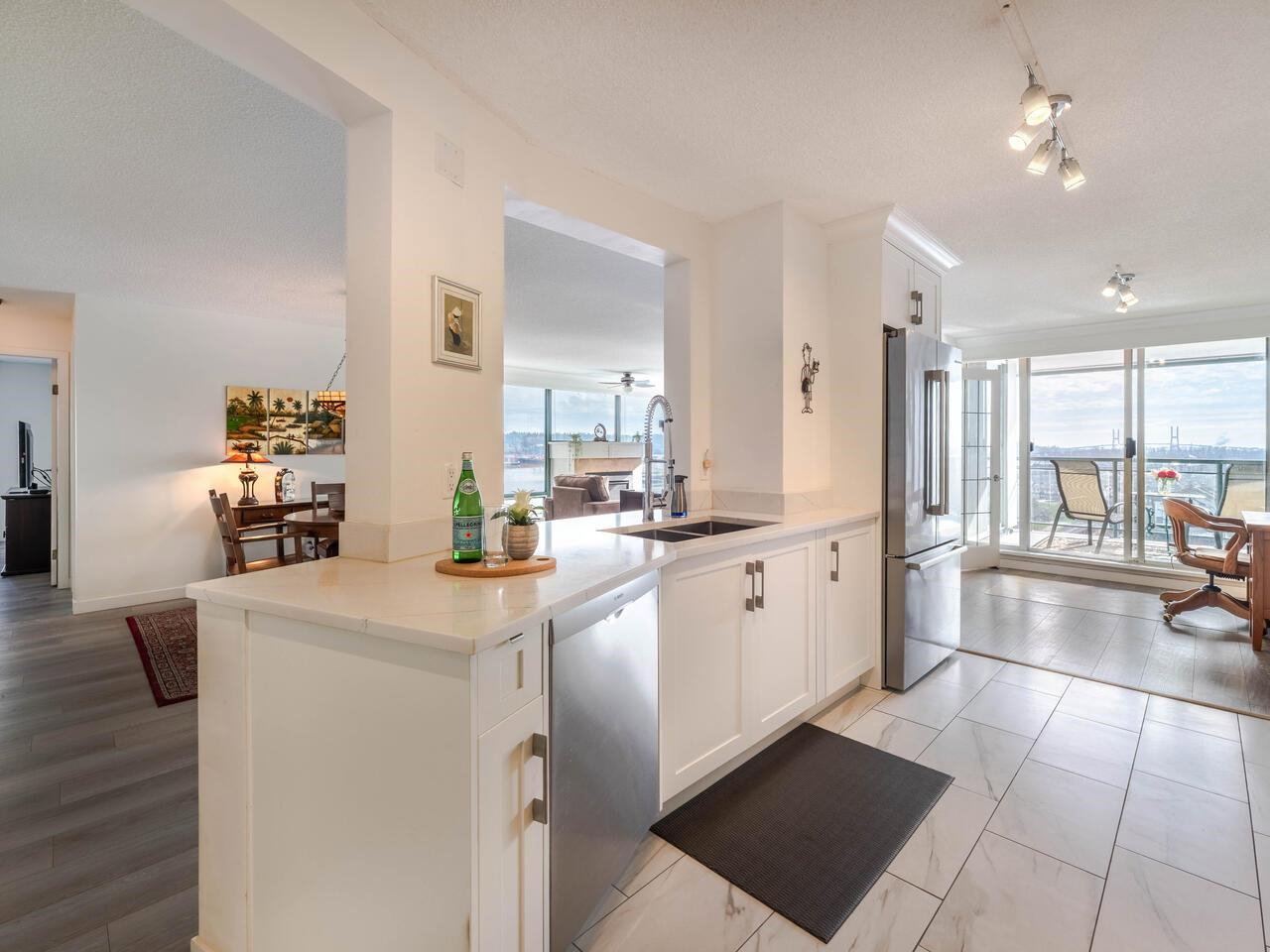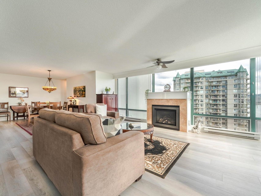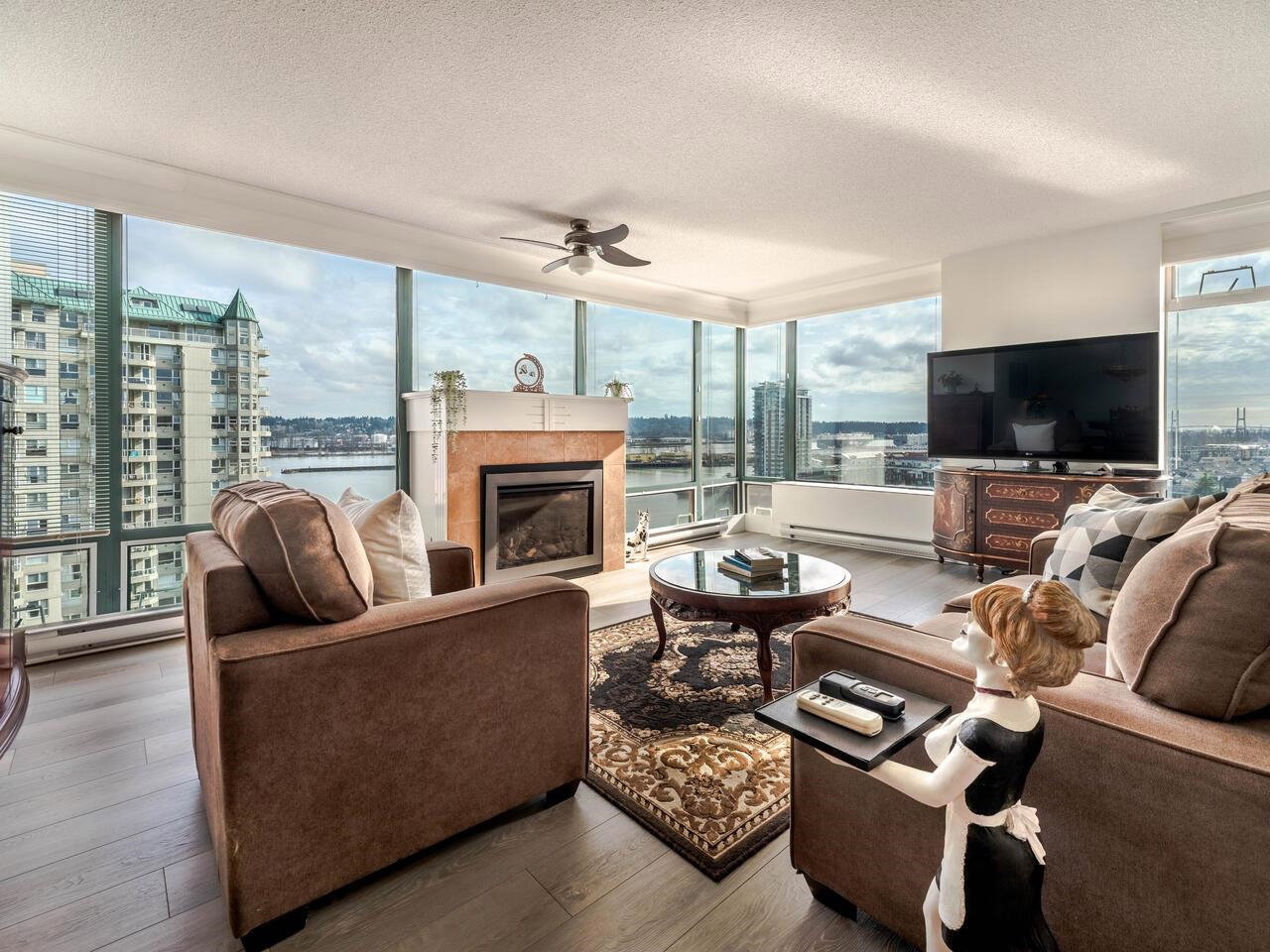 PRIME WATERFRONT at New Westminter Quay! Enjoy UNOBSTRUCTED EXPANSIVE VIEWS of the lively FRASER RIVER from your arm chair! From sunrise to sunset, immerse in the dynamics of a working river in the privacy of your own home! Upgrades and features of this fabulous 1,524 sf, 2 bdrm + den, 2 bath, upper floor southeast corner unit include an open & inviting modern chef’s kitchen, Bosch appliances, barn door walk-in pantry, laminate flooring, gas fireplace, and 92 sf open BBQ balcony. Perfect layout for entertaining & family gatherings! Amenities included pool, hot tub, sauna, party room & exercise area. Steps to the river boardwalk, parks & walking distance to restaurants, shopping, services & skytrain. TWO PARKING STALLS, rentals & 2 pets OK.