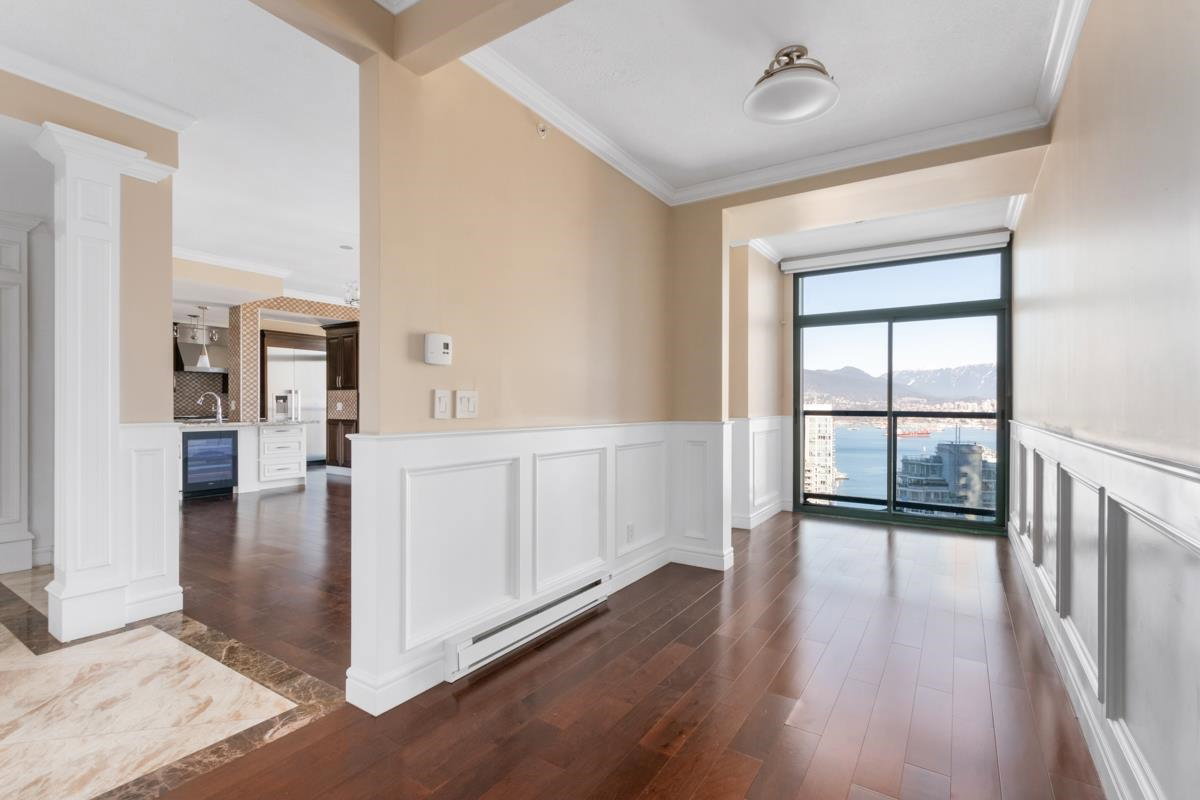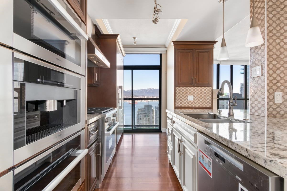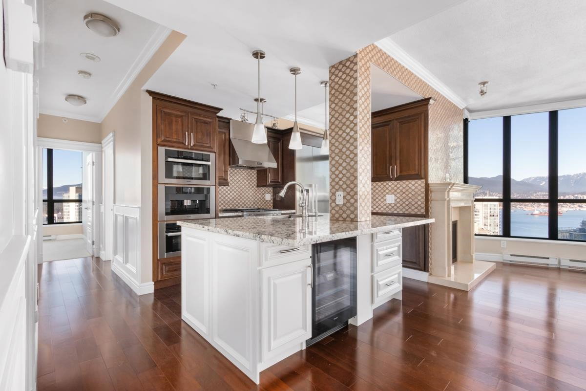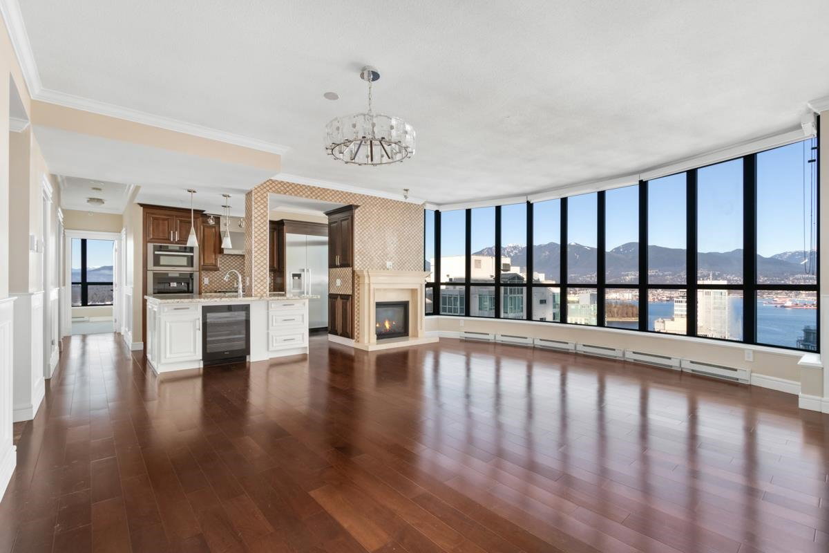 STUNNING OCEAN & MOUNTAIN VIEW!! Located in the prestigious beautiful Coal Harbour community, steps away from the picturesque seawall, Stanley Park, Robson St, Pacific Centre, urban convenience is right at your fingertips. It is the most PRIME and UNIQUE unit in this building, combining two corner units, both with incredible views stretching from Coal Harbour all the way to English Bay, not to mention it is sitting on the 31st floor and there is nothing in between the unit and the best view of Vancouver. Completely renovated in 2016, expect a luxurious yet modern lifestyle with 9 ft ceilings, high-end Miele appliances, maple cabinets, marble countertops & imported fireplace. TWO MASTER-BEDROOMS, and a 3rd bedroom+den+storage offer you ultimate privacy and functionality. CALL TODAY & VIEW!