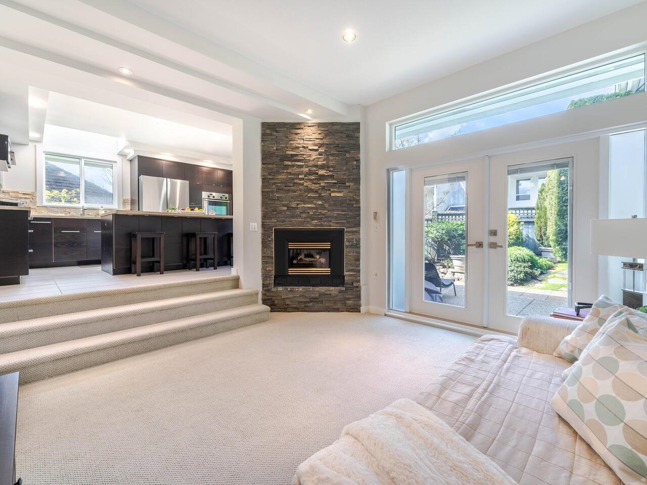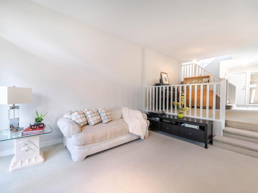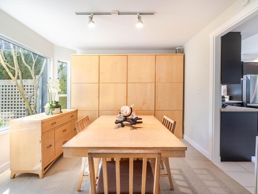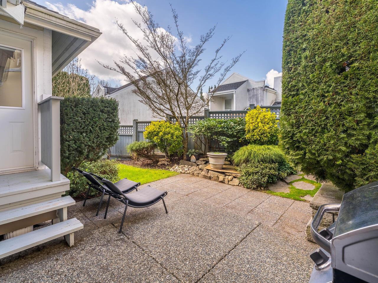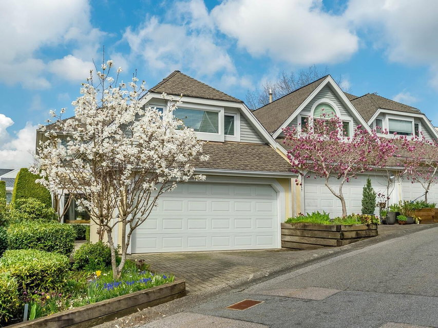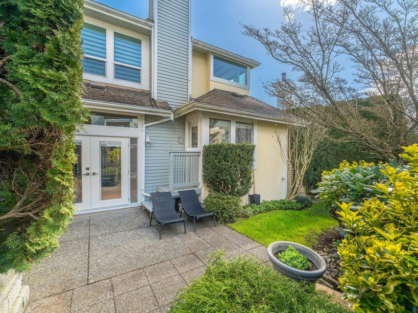 Come see this rarely available CONTEMPORARY 1,765 sf END UNIT on TWO LEVELS townhouse with abundance of NATURAL LIGHT and a DOUBLE GARAGE in the desirable RIVERSIDE TERRACE complex. Spacious 3 bdrms + large den (can be a family room/home office/flex space) + formal dining room + 2.5 baths. A GARDENER’S DELIGHT with huge private backyard with mature landscaping and a BBQ patio for entertaining. Features include sunken livingroom, gas fireplace, updated gourmet kitchen, stainless steel appliances, modernized bathrooms, skylight, new windows, new painting – all in IMMACULATE MOVE-IN CONDITION. Well managed pro-active complex. Steps to walking and biking trails, close to shopping and transit. See online virtual tour!