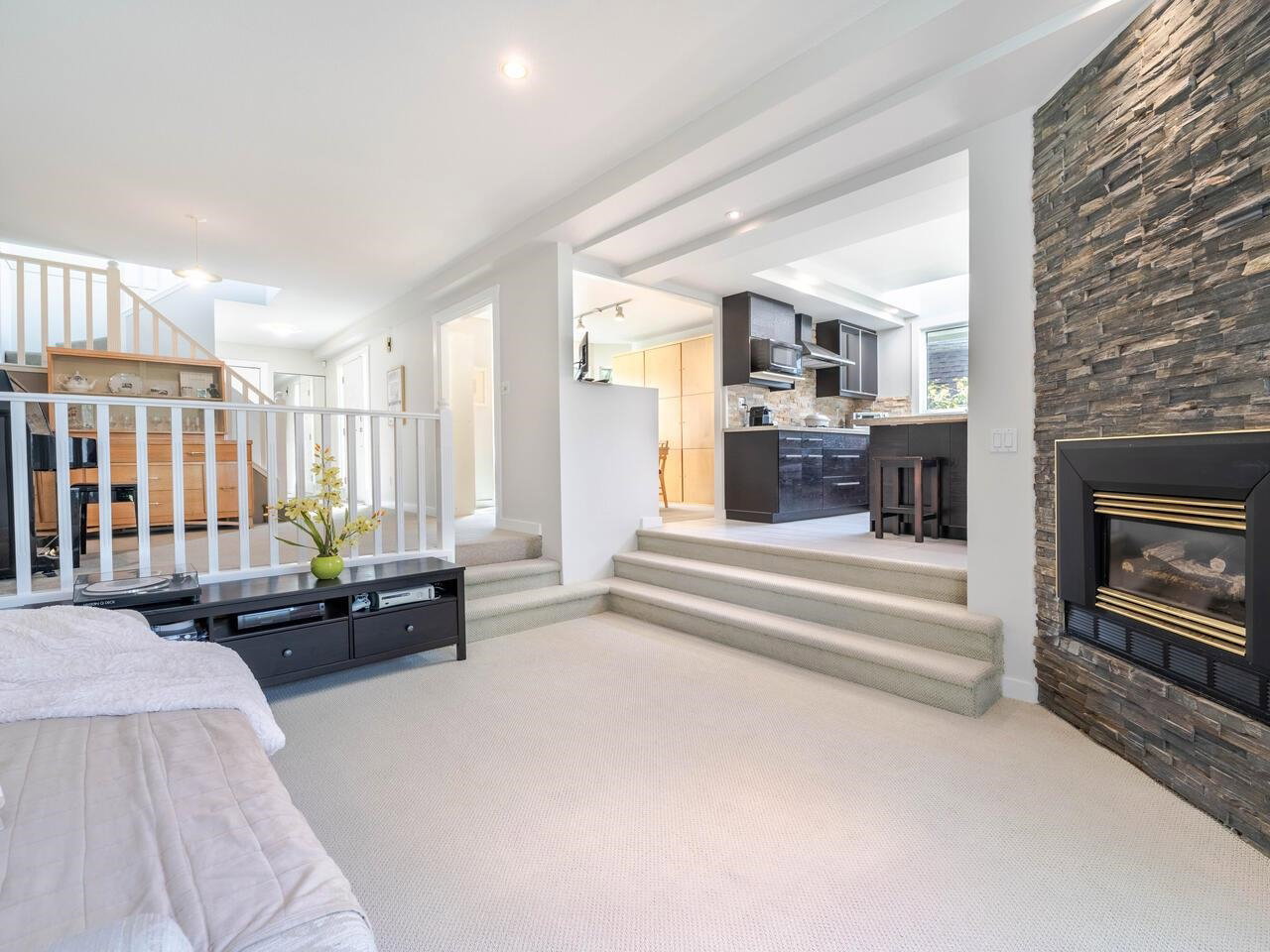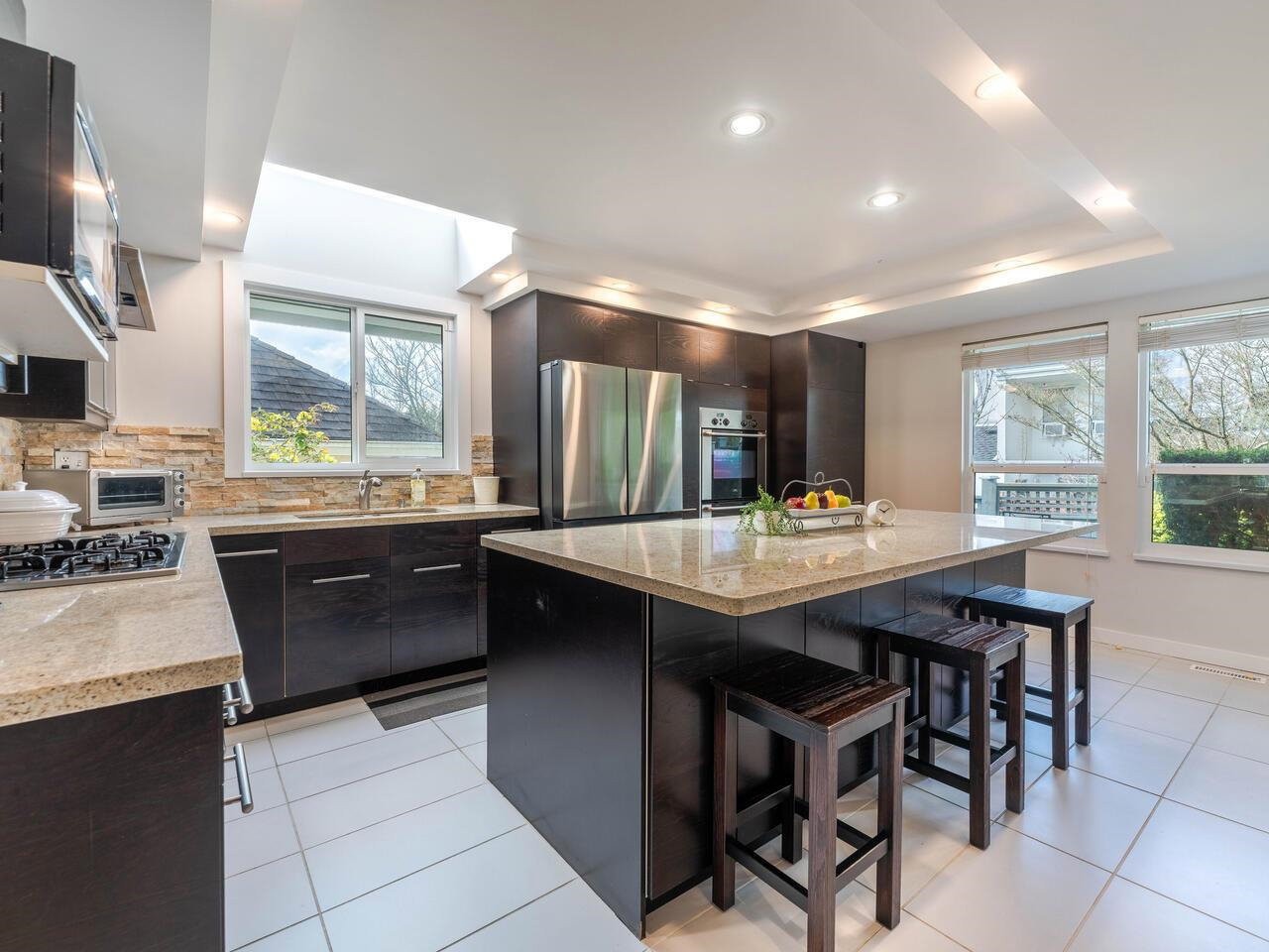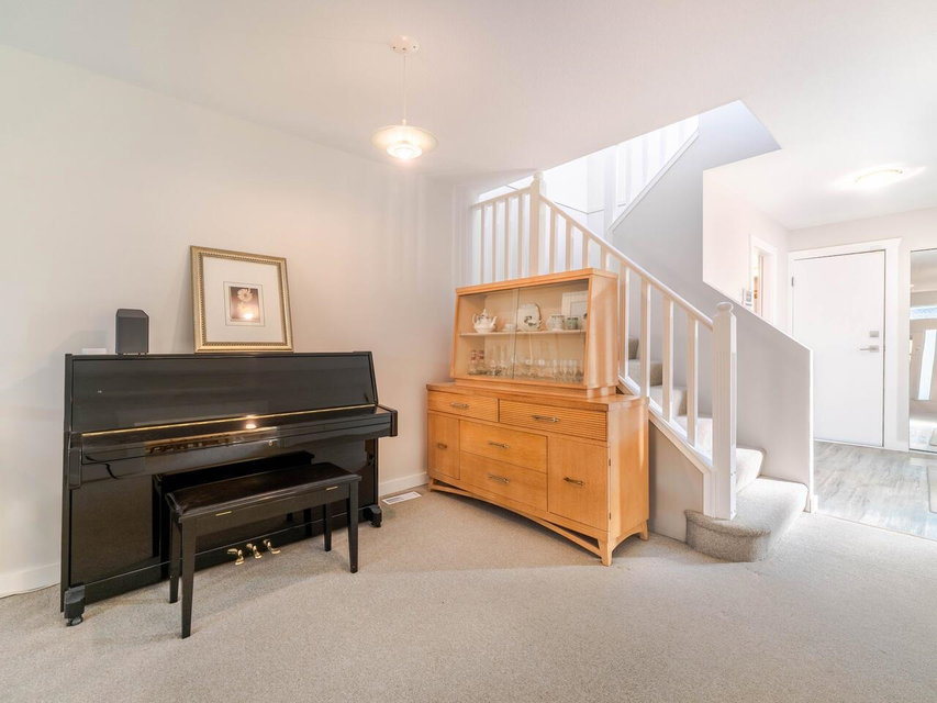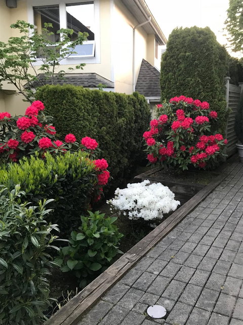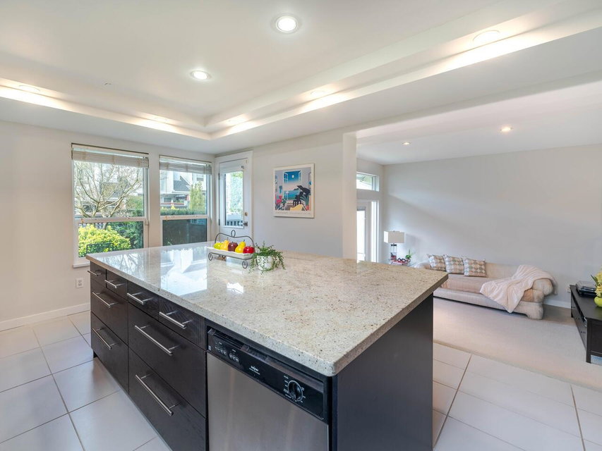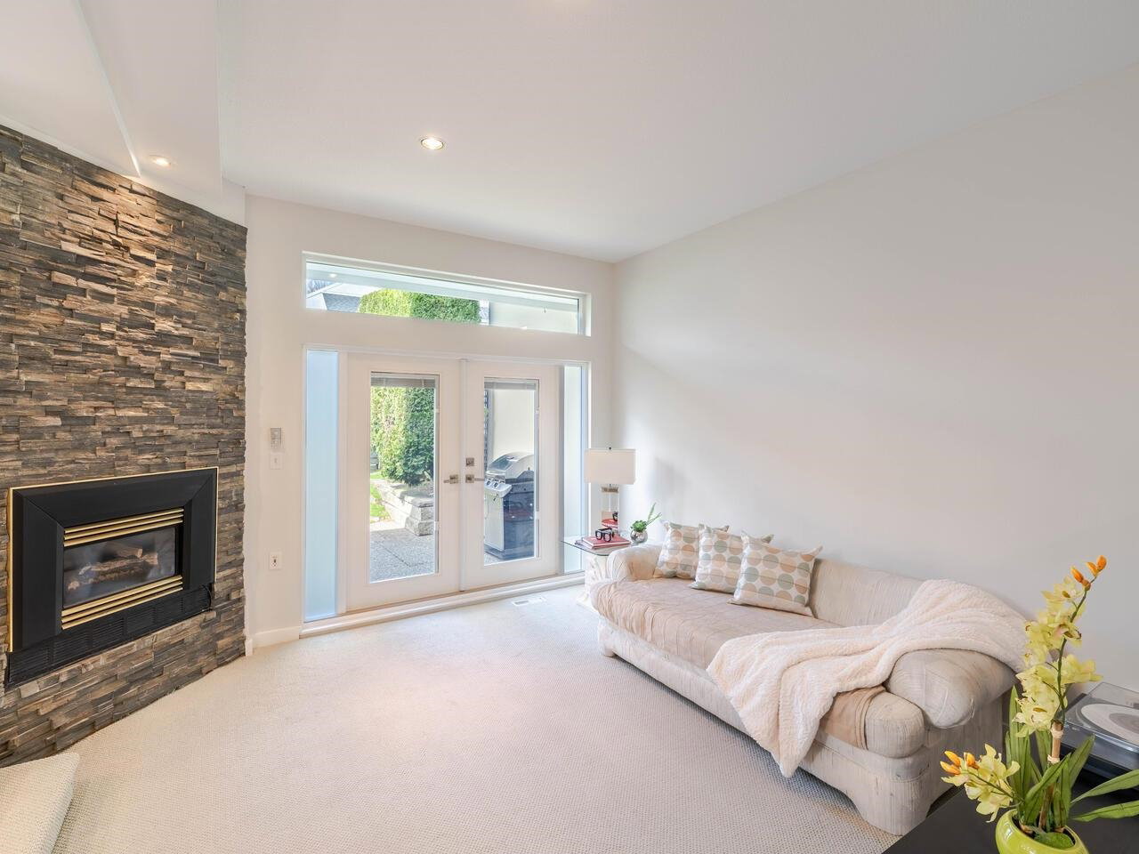 Come see this rarely available CONTEMPORARY 1,765 sf END UNIT on TWO LEVELS townhouse with abundance of NATURAL LIGHT and a DOUBLE GARAGE in the desirable RIVERSIDE TERRACE complex. Spacious 3 bdrms + large den (can be a family room/home office/flex space) + formal dining room + 2.5 baths. A GARDENER’S DELIGHT with huge private backyard with mature landscaping and a BBQ patio for entertaining. Features include sunken livingroom, gas fireplace, updated gourmet kitchen, stainless steel appliances, modernized bathrooms, skylight, new windows, new painting – all in IMMACULATE MOVE-IN CONDITION. Well managed pro-active complex. Steps to walking and biking trails, close to shopping and transit. See online virtual tour!
