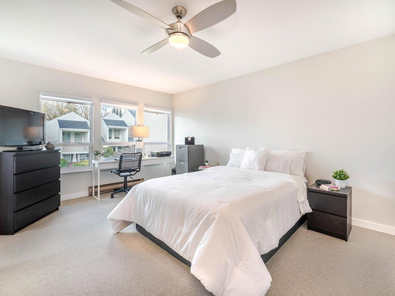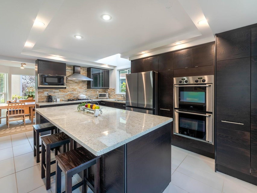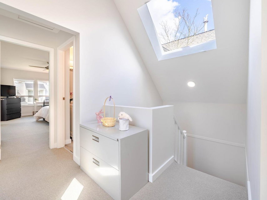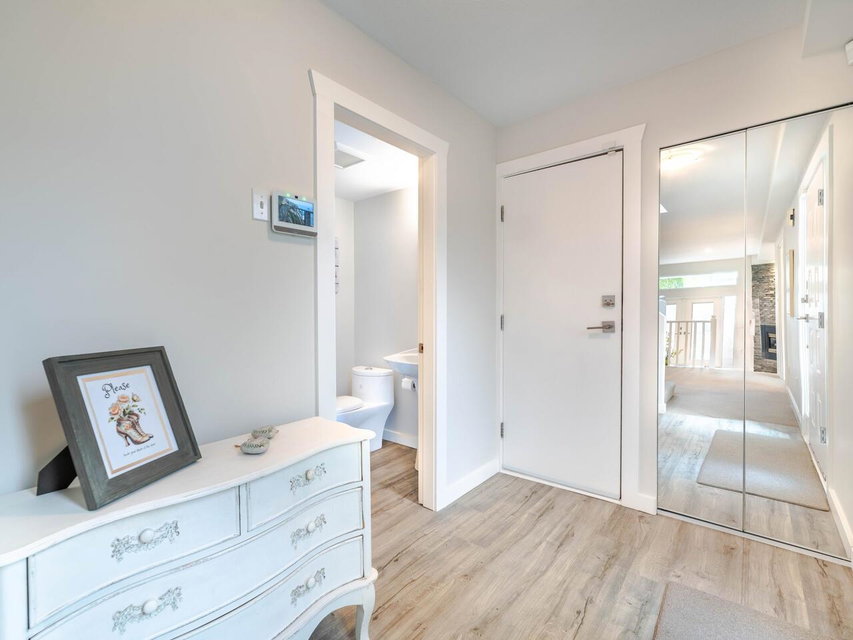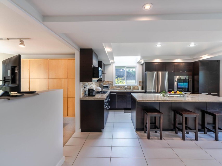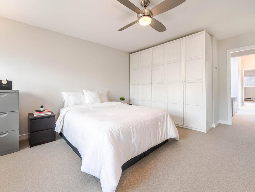 Come see this rarely available CONTEMPORARY 1,765 sf END UNIT on TWO LEVELS townhouse with abundance of NATURAL LIGHT and a DOUBLE GARAGE in the desirable RIVERSIDE TERRACE complex. Spacious 3 bdrms + large den (can be a family room/home office/flex space) + formal dining room + 2.5 baths. A GARDENER’S DELIGHT with huge private backyard with mature landscaping and a BBQ patio for entertaining. Features include sunken livingroom, gas fireplace, updated gourmet kitchen, stainless steel appliances, modernized bathrooms, skylight, new windows, new painting – all in IMMACULATE MOVE-IN CONDITION. Well managed pro-active complex. Steps to walking and biking trails, close to shopping and transit. See online virtual tour!